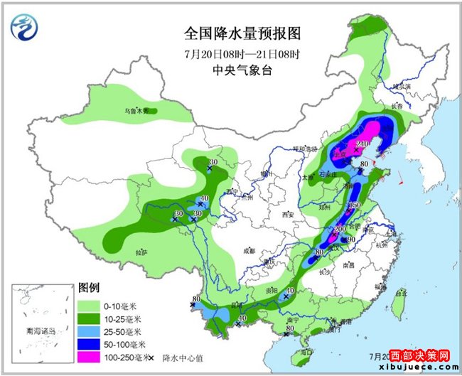 預(yù)計(jì),20日08時(shí)至21日08時(shí),湖南北部、湖北中東部、河南東南部、安徽西北部、江蘇西北部、山東中部、河北中東部、北京、天津、遼寧中南部及云南西部、廣西南部沿海等地有暴雨,其中,河北東北部、遼寧西南部、北京中南部、天津北部以及湖北中部偏北、河南東南部、安徽西北部等地的部分地區(qū)有大暴雨(100~240毫米);上述地區(qū)局地并伴有短時(shí)強(qiáng)降水、雷暴大風(fēng)等強(qiáng)對(duì)流天氣,最大小時(shí)雨強(qiáng)50~70毫米,局地可超過80毫米。