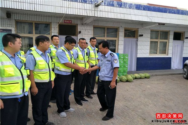 西部決策網(wǎng)訊( 鄒坤 通訊員 崔春月) 時值夏日,天氣持續(xù)高溫,2016年8月10日下午,靖邊縣公安局黨委委員、交警大隊長王世崗、辦公室主任黃瑞峰等一行來到該大隊城區(qū)二中隊慰問在高溫酷熱天氣下堅守崗位的一線民警,深刻表達了大隊黨委對一線民警的關心和關愛,并將防暑降溫物品及時送到了一線民警手中。