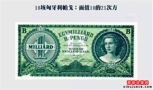 匈牙利帕戈在第二次世界大戰(zhàn)后失去價值,遭受到紀(jì)錄上有史以來最嚴(yán)重的貨幣貶值,物價飛漲到了無法控制的地步,計價時需要用到極高的位數(shù),面值10垓帕戈的鈔票,舊匈牙利的鈔票,面值是100,000,000,000,000,000,000,也就是10的21次方帕戈(可能紙幣上實在放不下這么多0,所以面額是用文字表示的)。