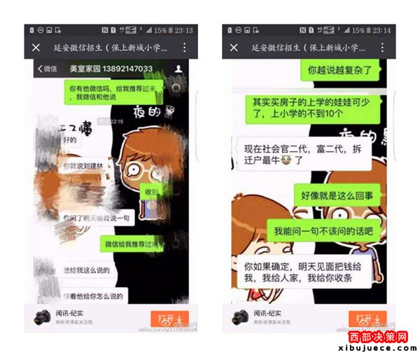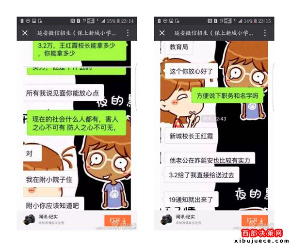 近日,一則題為《延安微信招生(3.2萬保上新城小學(xué))請(qǐng)相關(guān)部門給予調(diào)查公布真相》的帖子在朋友圈瘋傳,內(nèi)容是一位微信名叫“延安微信招生(保上新城小學(xué))”的微友,聲稱只要花3.2萬元,保證可以在新區(qū)小學(xué)入學(xué),并解釋有中間人,錢并不是直接給校長(zhǎng)王紅霞,但愿意提供自己的車號(hào)、身份證號(hào)、家庭住址等信息作為擔(dān)保。3.2萬真的能夠保上延安新區(qū)小學(xué)嗎?事情真相究竟如何,記者展開調(diào)查。