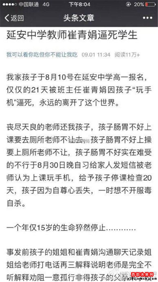 西部決策網(wǎng)訊 近日,據(jù)微博我可以看你吃但你不能讓我吃,爆料,我家孩子于8月10號在延安中學(xué)高一報(bào)名,21天被班主任崔青娟因孩子“玩手機(jī)”逼死“。