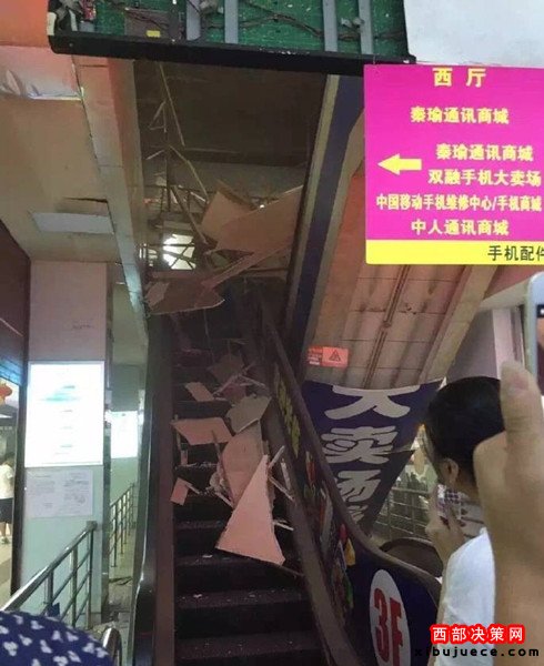 (通訊員 展?。?nbsp;今天中午1點左右,西安市西華門海星智能廣場四樓賣場電梯頂?shù)蹴斖蝗幻撀?。商戶們說,房頂是木質結構,坍塌毫無預兆。事故所幸暫時沒有人員受傷!