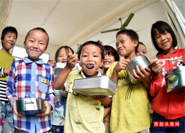 10月10日,在廣西大化瑤族自治縣七百弄鄉(xiāng)弄雄小學(xué),同學(xué)們在吃營養(yǎng)餐。