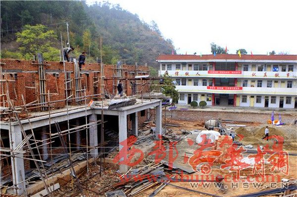 10月20日上午,在山陽縣高壩店鎮(zhèn)石橋村小學(xué),偌大的操場中間用一堵墻隔成兩半,一半是學(xué)生活動(dòng)場所,另一半是一棟剛剛建設(shè)的村委會(huì)辦公樓。學(xué)校的一、三樓用于村委會(huì)、教職工辦公休息,二層學(xué)生上課。