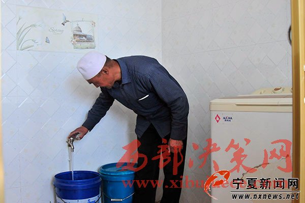 在海原水務(wù)局曹洼水利工作站站長牛志遠(yuǎn)的帶領(lǐng)下,我們來到了白崖村村民馬正海的家。這是個干凈整潔的院落,兩間并排的磚瓦房,步入屋內(nèi),馬正海正在教老伴如何使用洗衣機(jī)。“50多歲了第一次用洗衣機(jī),還不會操作呢” ,馬正海的老伴笑著說,“今年4月家里通上自來水,前陣子就去買了臺洗衣機(jī),這在之前想都不敢想。”