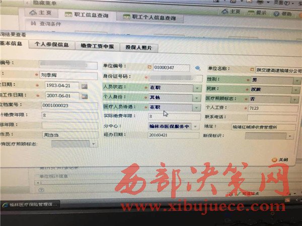 為了進(jìn)一步了解到底是陜西省交通集團(tuán)榆靖分公司紀(jì)委部造假還是陜蒙界收費(fèi)站職工(提供的考勤表上有明顯涂改痕跡,天數(shù)是28天)和站長自己(自敘錄音)一起造假。在合療辦調(diào)取查看的合療系統(tǒng)顯示,單位編號01000347,名稱陜交建高速榆靖分公司,劉某工資7123元。