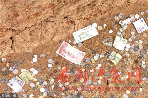 除硬幣外,散落在地的還有花花綠綠的紙幣,面額從1元到50元不等,甚至有100元的。