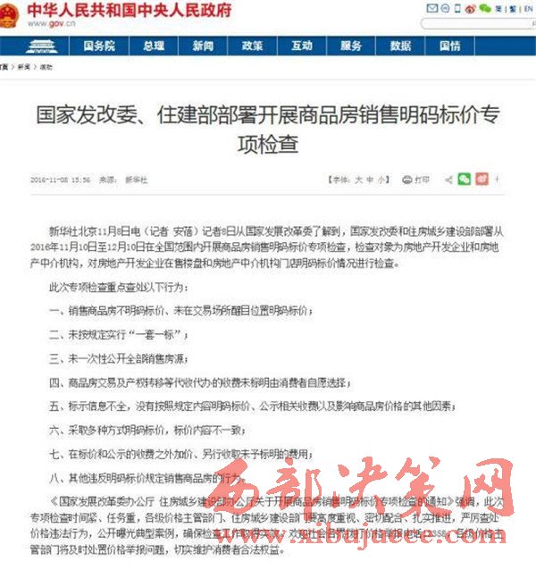 近日,國(guó)家發(fā)改委及住建部聯(lián)合發(fā)布了對(duì)商品房“明碼標(biāo)價(jià)”的新一輪整治措施。部署從2016年11月10日至12月10日在全國(guó)范圍內(nèi)開(kāi)展商品房銷(xiāo)售明碼標(biāo)價(jià)專(zhuān)項(xiàng)檢查。此次專(zhuān)項(xiàng)檢查重點(diǎn)查處以下八類(lèi)行為。“明碼標(biāo)價(jià)”、“一套一標(biāo)”、“醒目”、“自愿”、“一致”成為重點(diǎn)關(guān)鍵詞。
