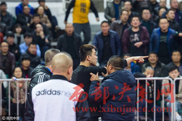 第一次薛飛走向籃架的時(shí)候,看臺上的球迷們就情緒激動(dòng)地起哄,大罵“打他!打他!”