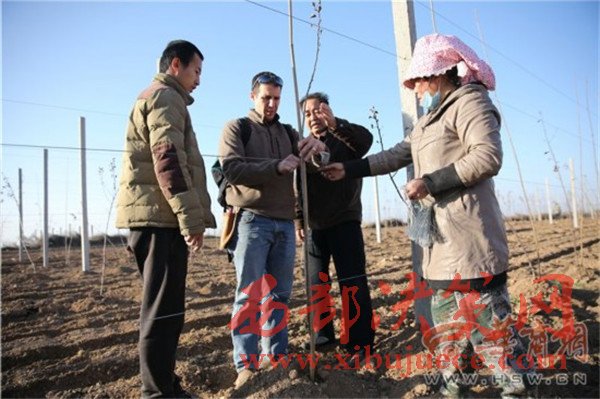 12月8日上午8時(shí)30分,淳化縣卜家鎮(zhèn)蔣家山村,當(dāng)?shù)毓r(nóng)剛吃完早飯,林東已從100多公里外的西安趕到這里,他一邊用熟練的中文問(wèn)大家“咥飽了沒(méi)有”,一邊從背包里掏出果樹(shù)剪刀,走進(jìn)地里查看樹(shù)苗的過(guò)冬情況。果園的技術(shù)員拿個(gè)大本子跟在林東后邊做記錄,遇到難點(diǎn)林東就親自示范。