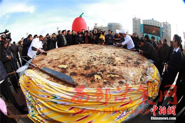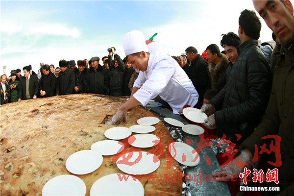 據(jù)悉,庫麥其是維吾爾族傳統(tǒng)美食,又稱且末“大披薩”,用300公斤面粉、200公斤羊肉、60公斤洋蔥,花費(fèi)4個(gè)半小時(shí)制成,直徑達(dá)3.65米,寓意一年365天,天天有肉馕吃。圖為廚師忙著為游客切“最大的庫麥其”。
