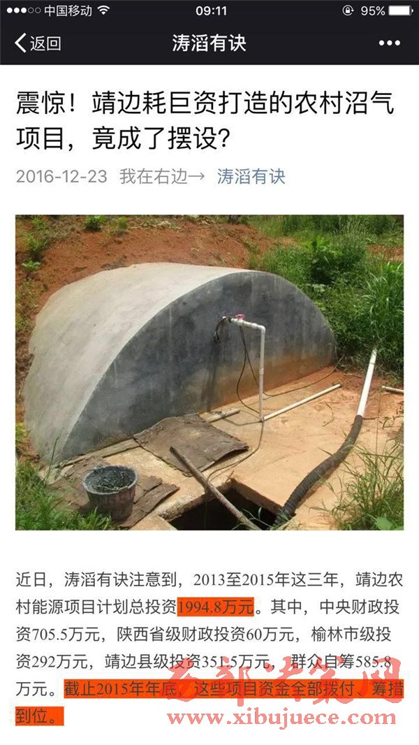 雖然靖邊縣審計局的審計報告,語言高度凝練,也沒給出相應的案例和圖片證明,但很顯然,近三年以來,靖邊縣能源辦手持巨額撥款,全力推進的農村沼氣工程,在今年春天就變成了“利用率低、廢棄率高”的擺設。如果是這樣的話,投入再多的財力人力,又有什么意義呢?