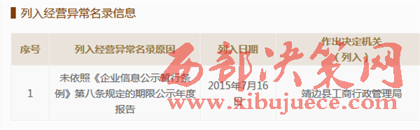 靖邊興發(fā)公司2015年7月16被工商部門列入經營異常名錄