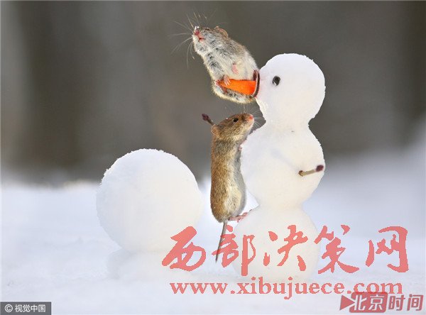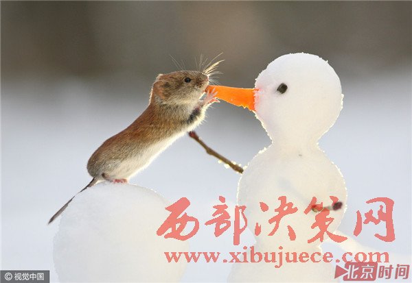 田鼠與小雪人的"親密接觸"