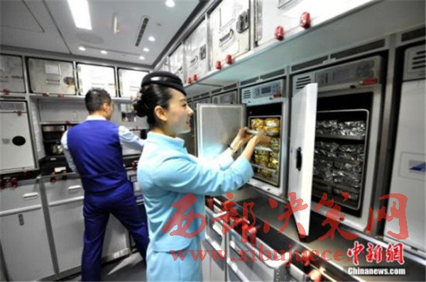 圖為空乘在飛機上整理烤箱內(nèi)的食物。