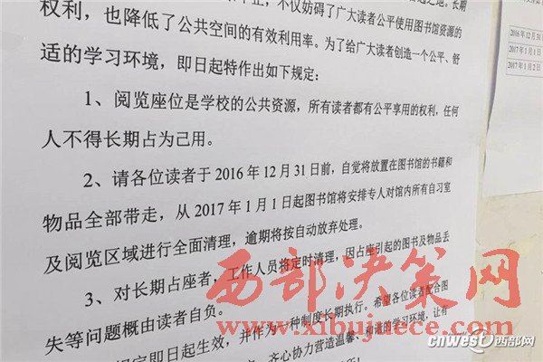 記者看到就在圖書館的入口貼著圖書館關(guān)于清理閱覽室座位的通知,上門寫著因?yàn)轲^內(nèi)占座問題屢禁不止,請同學(xué)們在12月31號(hào)前將自己的物品帶走,從1月1號(hào)起將全面清理閱覽室,通知貼出的時(shí)間是12月28號(hào)。