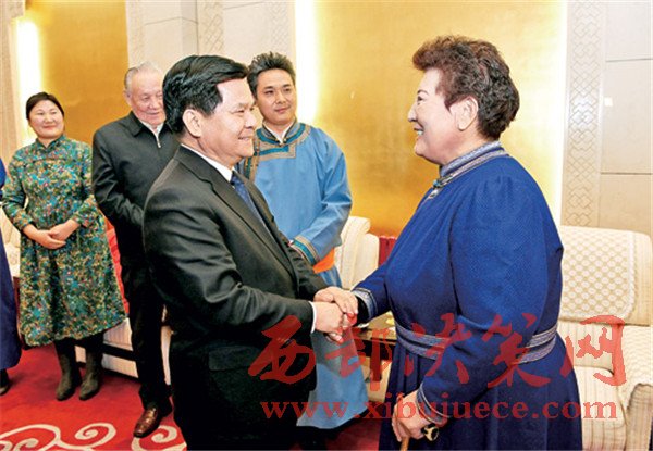 1月16日晚,自治區(qū)黨委書記李紀恒在觀看大型蒙古族歌劇《愛在胡楊》演出前,接見了總策劃德德瑪等編創(chuàng)人員。