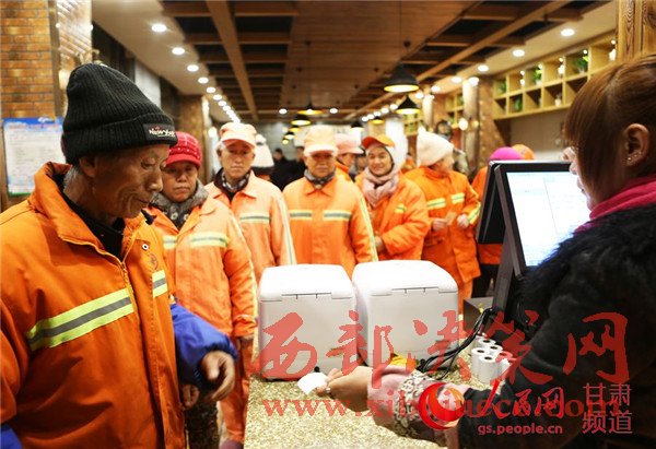 19日,蘭州環(huán)衛(wèi)工在一家牛肉面店享用愛心早餐。