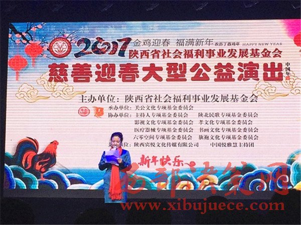 1月18日晚,由陜西省社會福利事業(yè)發(fā)展基金會主辦、關(guān)公文化專項基金委員會承辦、主持人專項基金委員會、陜北民歌專項基金委員會等協(xié)辦、陜西省民政廳指導(dǎo)的《慈善迎春》大型公益演出在蓮湖區(qū)絲路藝術(shù)劇院成功舉辦。