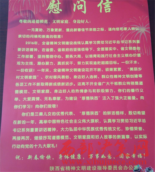慰問組每到一戶都詳細詢問了模范們的家庭生產(chǎn)和生活狀況,囑咐他們保重身體,希望他們珍惜榮譽,再接再厲,繼續(xù)發(fā)揮模范帶頭作用,在道德建設(shè)上再樹新形象,再展新風(fēng)采,再創(chuàng)新佳績。同時也號召全縣人民學(xué)好人、做好人,崇尚道德,弘揚善舉率先垂范,樹立榜樣。