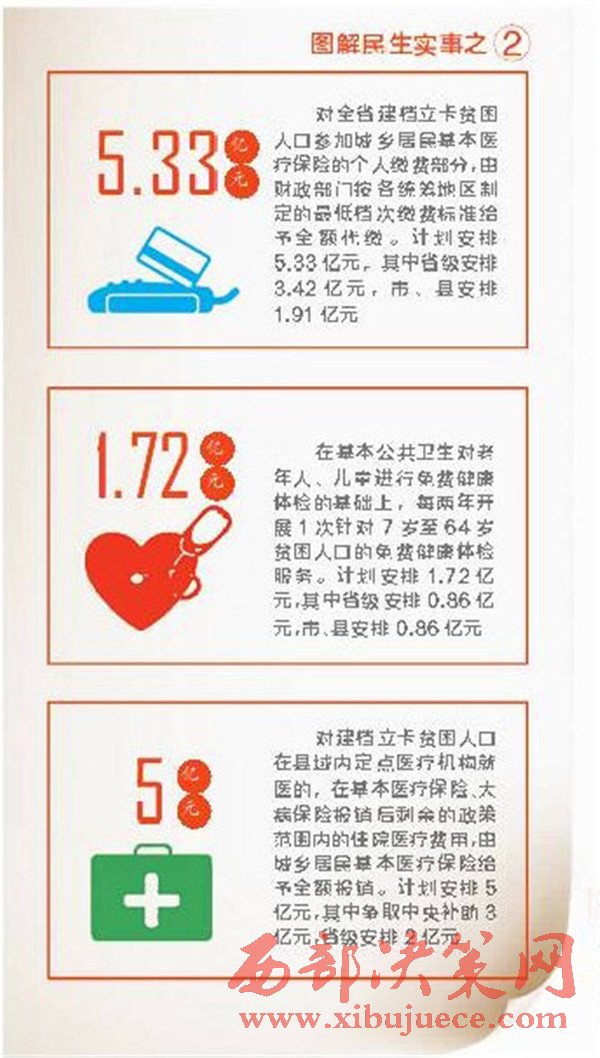對建檔立卡貧困人口在縣域內(nèi)定點醫(yī)療機構(gòu)就醫(yī)的,在基本醫(yī)療保險、大病保險報銷后剩余的政策范圍內(nèi)的住院醫(yī)療費用,由城鄉(xiāng)居民基本醫(yī)療保險給予全額報銷。計劃安排5億元,其中爭取中央補助3億元,省級安排2億元