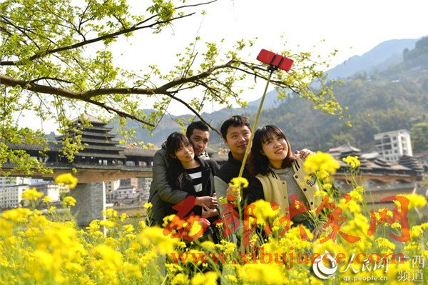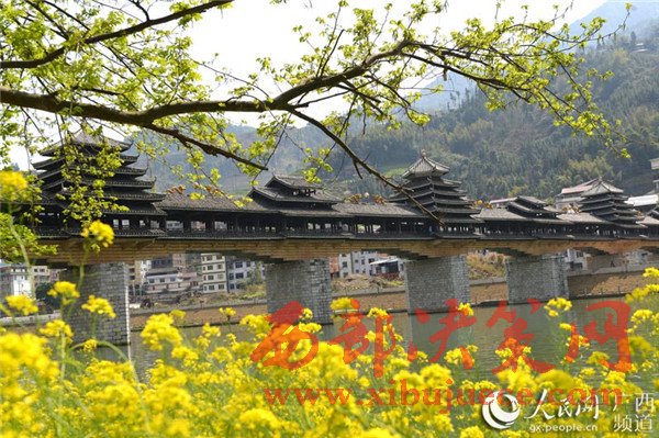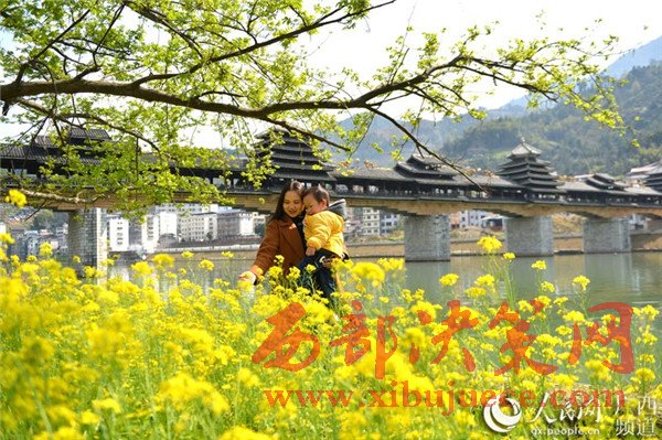 春暖花開時節(jié),廣西龍勝各族自治縣民族風(fēng)雨橋旁的油菜花競相綻放,風(fēng)雨橋在油菜花的點綴下美不勝收,形成了一道美麗的春天景致,充滿著濃郁的春天氣息,吸引眾多游客前來觀賞拍照。
