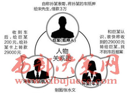 湖北人宋先生在西安城南電視塔附近開了一家二手車經(jīng)銷店,今年2月5日,曾在他手上抵押過物品的男子巨某打電話稱,要借款2萬元,用一輛SUV做抵押。“巨某說車是表妹孫某的,我提出本人來抵押,但巨某稱表妹不方便來。”