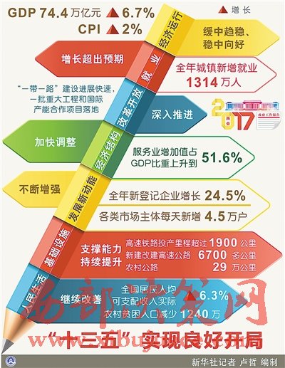 經(jīng)濟(jì)運(yùn)行緩中趨穩(wěn)、穩(wěn)中向好。國內(nèi)生產(chǎn)總值達(dá)到74.4萬億元,增長6.7%,名列世界前茅,對全球經(jīng)濟(jì)增長的貢獻(xiàn)率超過30%。居民消費(fèi)價(jià)格上漲2%。工業(yè)企業(yè)利潤由上年下降2.3%轉(zhuǎn)為增長8.5%,單位國內(nèi)生產(chǎn)總值能耗下降5%,經(jīng)濟(jì)發(fā)展的質(zhì)量和效益明顯提高。