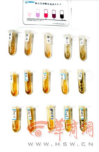 華商報(bào)記者在市場(chǎng)上購(gòu)買了新鮮的菠菜,白菜,小白菜,油麥菜,青菜,拿到西安營(yíng)養(yǎng)學(xué)會(huì),專家通過(guò)實(shí)驗(yàn)的方法,檢測(cè)新鮮蔬菜、冰箱存放48小時(shí)的蔬菜、常溫存放48小時(shí)的蔬菜中亞硝酸鹽含量的變化。