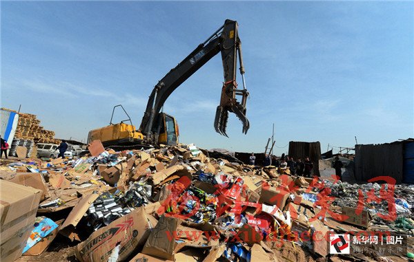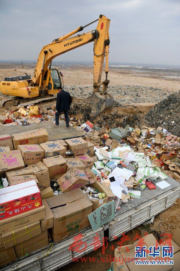3月14日,在寧夏寧東垃圾填埋場,工作人員將假冒偽劣商品進行填埋處理。“3·15”國際消費者權(quán)益日即將到來之際,銀川市市場監(jiān)督管理局集中展示并銷毀食品、藥品、電器等32個類別的假冒偽劣商品。