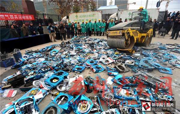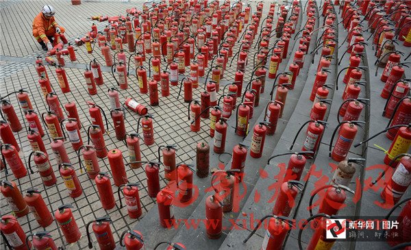 2012年11月6日,四川省成都市,一批假冒偽劣的消防滅火器被銷毀。當日,四川省“119”消防宣傳周啟動暨消防產(chǎn)品形式安檢公開處理假冒偽劣消防器材產(chǎn)品集中銷毀儀式在成都舉行。