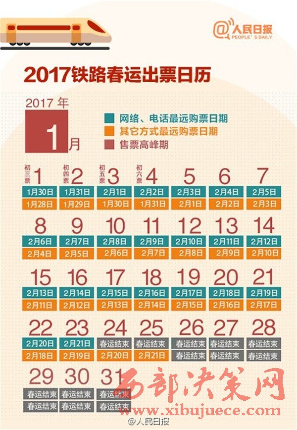 2017年春運從1月13日至2月21日,是近5年來開始時間最早的春運,你做好搶票準備了嗎?目前火車票預售期30天,除夕當天的票12月29日開搶,網(wǎng)絡購票須在30分鐘內付款,發(fā)車前2天或12小時可“撿漏”。