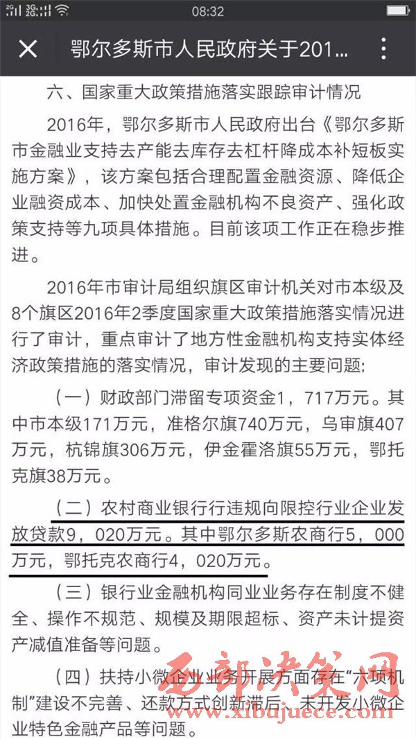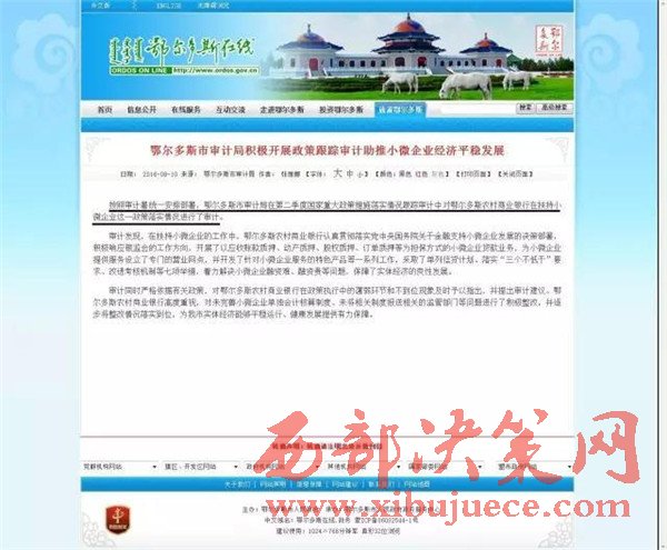 鄂爾多斯市人民政府網(wǎng)站刊登文章中稱:按照審計(jì)署統(tǒng)一安排部署,鄂爾多斯市審計(jì)局在第二季度國家重大政策措施落實(shí)情況跟蹤審計(jì)中對鄂爾多斯農(nóng)村商業(yè)銀行在扶持小微企業(yè)這一政策落實(shí)情況進(jìn)行了審計(jì)。