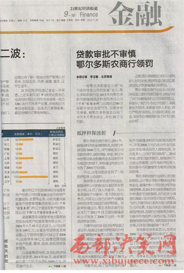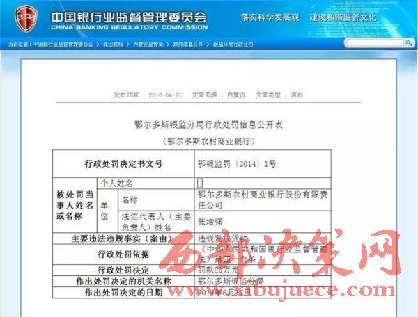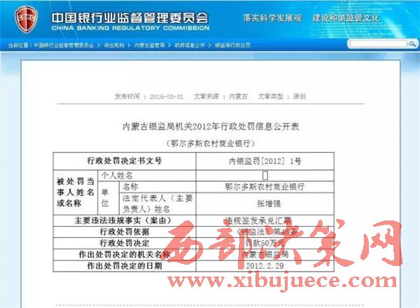 另查明:鄂爾多斯農(nóng)村商業(yè)銀行法人張?jiān)鰪?qiáng),又是內(nèi)蒙古信用聯(lián)合社理事會理事,共產(chǎn)黨黨員,管理不善,多次因非法經(jīng)營舉報(bào),其中2012年2月29日,因違規(guī)簽發(fā)承兌匯票被內(nèi)蒙古銀監(jiān)局罰款50萬。