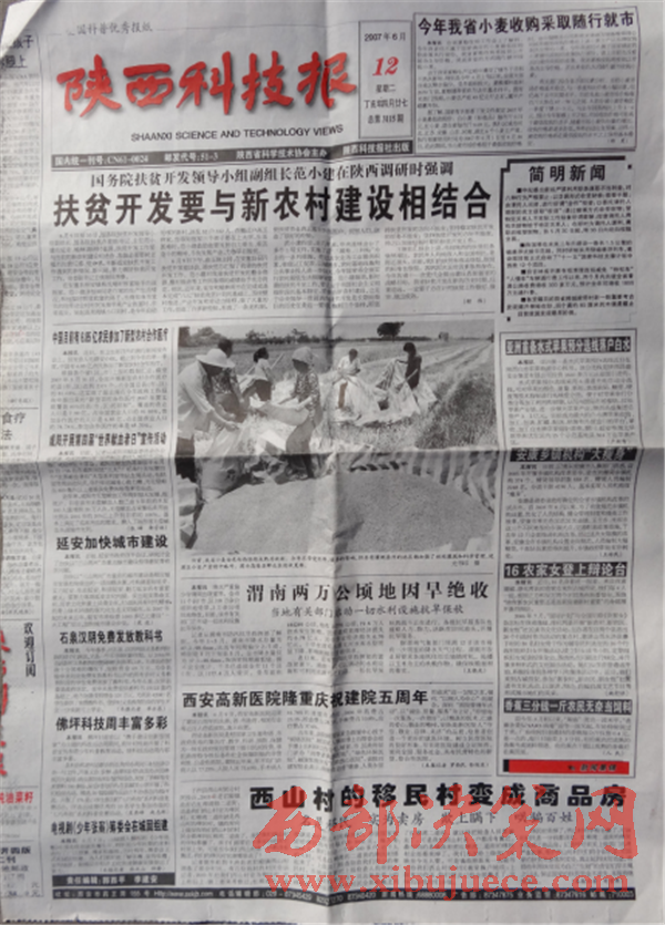 后附:2007年6月12日刊登稿件的陜西科技報一張。