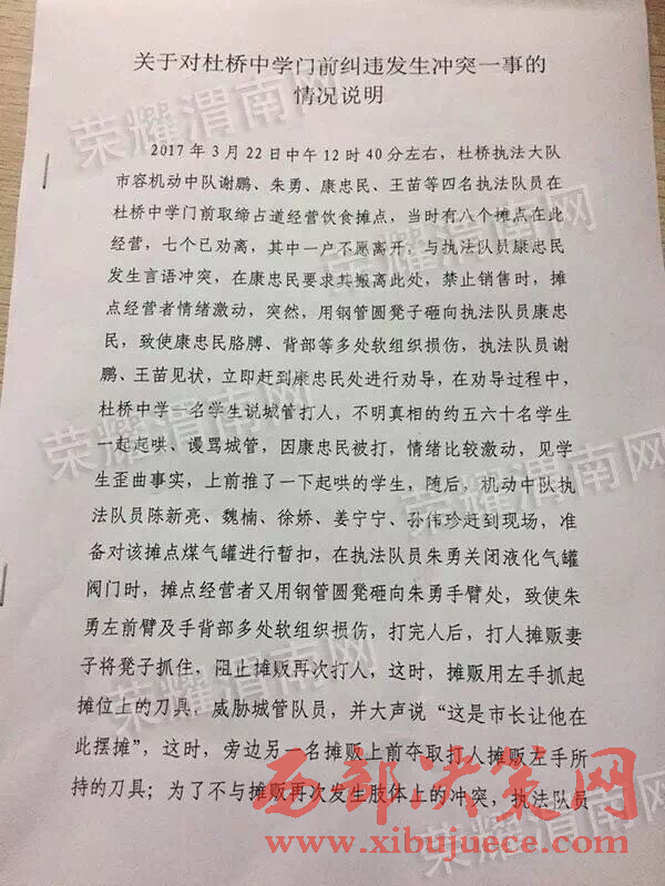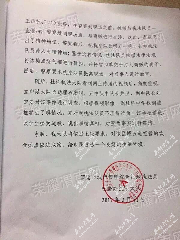 當(dāng)晚6點以后,涉事執(zhí)法隊員所屬執(zhí)法大隊杜橋執(zhí)法大隊書面回復(fù)便在網(wǎng)絡(luò)中被網(wǎng)友們不斷的轉(zhuǎn)載。據(jù)該回復(fù)稱:2017年3月22日中午12時40分左右,杜橋執(zhí)法大隊市容機(jī)動中隊謝鵬、朱勇、康忠民、王苗等4名執(zhí)法隊員在杜橋中學(xué)門前取締占道經(jīng)營飲食攤點,當(dāng)時有八個攤點在此經(jīng)營,七個已勸離,其中一戶不愿離開,與執(zhí)法隊員康忠民發(fā)生言語沖突,在康忠民要求其搬離此處,禁止銷售時,攤點經(jīng)營者情緒激動,突然,用鋼管圓凳子砸向執(zhí)法隊員康忠民,致使康忠民胳膊、背部等多處軟組織損傷,執(zhí)法隊員謝鵬、王苗等見狀,立即趕到康忠民處進(jìn)行勸導(dǎo),在勸導(dǎo)過程中,杜橋中學(xué)一名學(xué)生說城管打人,不明真相的約五六十名學(xué)生一起起哄、謾罵城管,因康忠民被打,情緒比較激動,見學(xué)生歪曲事實,上前推了一下起哄的學(xué)生,隨后,機(jī)動中隊執(zhí)法隊員朱勇、陳新亮、魏楠、徐嬌、姜寧寧、孫偉珍趕到現(xiàn)場,準(zhǔn)備對該攤點煤氣罐進(jìn)行暫扣,在執(zhí)法隊員朱勇關(guān)閉液化氣罐閥門時,攤點經(jīng)營者用鋼管圓凳砸向朱勇手臂處,致使朱勇左前臂及手背部多處軟組織損傷,打完人后,打人攤販妻子將凳子抓住,阻止攤販再次打人,這時,攤販用左手抓起攤位上的刀具,威脅城管隊員,并大聲說“這是市長讓他在此擺攤”,這時,旁邊另一名攤販上前奪取打人攤販左手所持的刀具;為了不與攤販再次發(fā)生肢體上的沖突,執(zhí)法隊員王苗撥打110報警,在警察到現(xiàn)場之前,攤販與執(zhí)法隊員一直僵持;警察趕到現(xiàn)場后,與商販進(jìn)行交涉,這時,商販亮出了精神病證,警察看后,把執(zhí)法隊員叫到一旁,告知執(zhí)法隊員此人有精神?。昏b于這種情況,執(zhí)法隊員依據(jù)法律法規(guī),將該攤點煤氣罐進(jìn)行暫扣,并將暫扣單交于打人商販的妻子,隨后,警察要求執(zhí)法隊員撤離現(xiàn)場,對當(dāng)事人進(jìn)行教育。