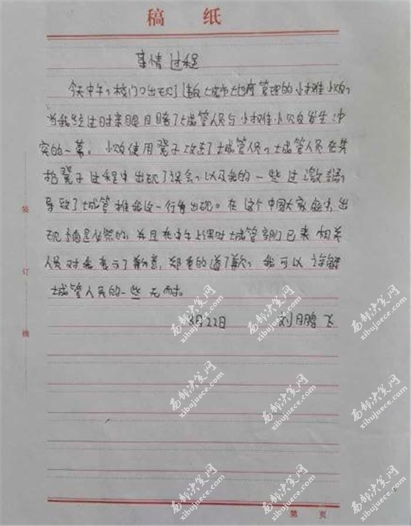 同時,該回復(fù)還出現(xiàn)了學(xué)生和兩名執(zhí)法人員面對面的照片,在回復(fù)的最后有該學(xué)生手寫的事情過程。據(jù)該學(xué)生手寫過程稱,當(dāng)時學(xué)生親眼目睹了城管與小販發(fā)生沖突的一幕,既然是親眼目睹,為何會有視頻中的“隨便打人”一說嗎?可想而知孩子在寫這份事情過程的時候是什么樣的心情。