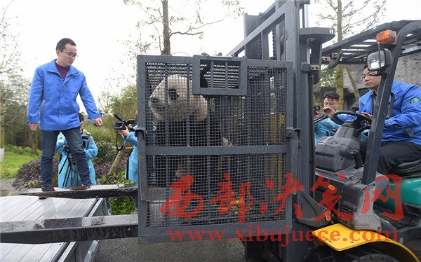 3月24日,工作人員在中國大熊貓保護研究中心都江堰基地隔離檢疫區(qū)準備將大熊貓“寶寶”搬運至盼盼園。
