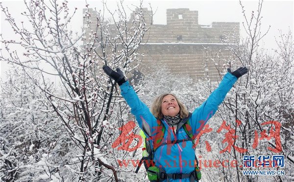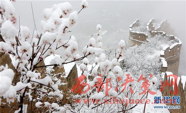 當(dāng)日,北京市懷柔區(qū)黃花城水長(zhǎng)城迎來(lái)降雪,杏花、白雪與長(zhǎng)城構(gòu)成了一幅幅美麗畫(huà)卷。