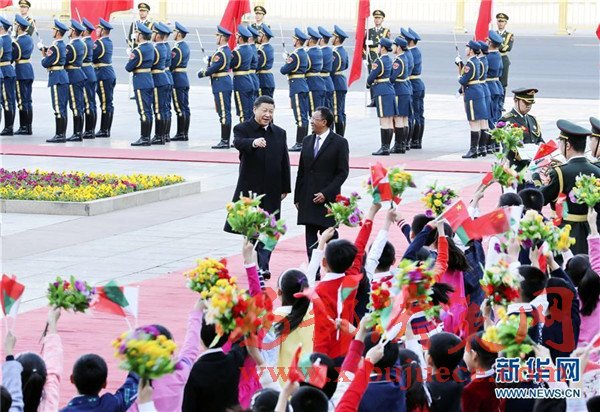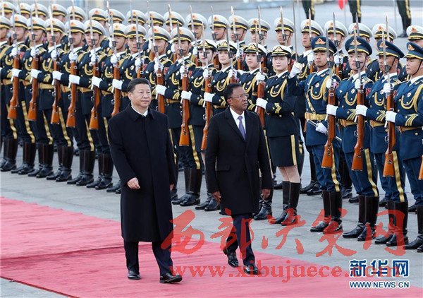 3月27日,國家主席習(xí)近平在北京人民大會(huì)堂同馬達(dá)加斯加總統(tǒng)埃里舉行會(huì)談。這是會(huì)談前,習(xí)近平在人民大會(huì)堂東門外廣場(chǎng)為埃里舉行歡迎儀式。