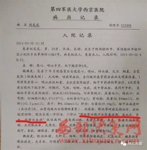 2015年3月我小兒子劉龍龍由感冒引發(fā)急性尿毒癥第五期,從此我們一家過上了人間少有的被恐懼包圍的日子。時至今日我們輾轉(zhuǎn)榆林星元醫(yī)院、西安西京醫(yī)院、西安交大附屬醫(yī)院等大醫(yī)院治療,前后做了8次血漿置換腹膜透析手術。每天透析3、4次,每一個月病人住院花費四、五萬元。2年時間花費110多萬元,現(xiàn)在就靠透析維持生命。因此醫(yī)生對我說,我兒子做透析不是長久之計,唯