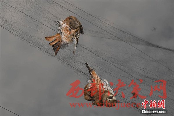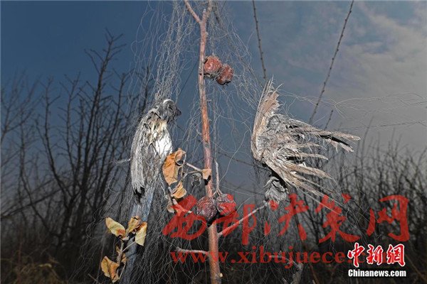 2月14日,山西太原郊區(qū)的一間果園內,為了保護農作物的果農搭建了捕鳥網(wǎng),三百余只不同種類的鳥被網(wǎng)圍困致死,有些已腐爛風干。