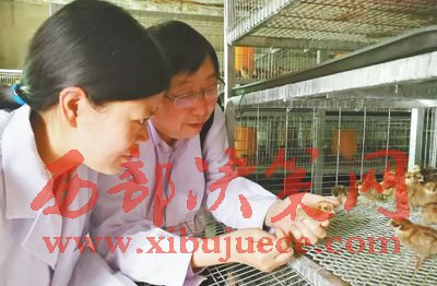 蔣超群(左)和專家在觀察雛雞。(岳旭東 攝)