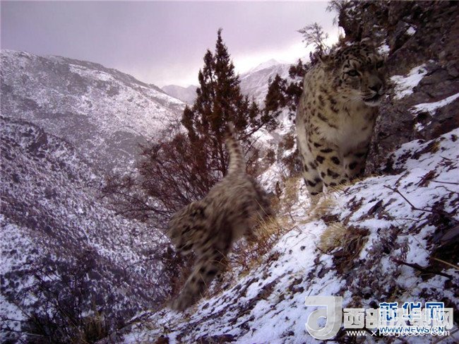 紅外相機(jī)在11月14日野外拍攝到的雪豹和其幼崽。新華社發(fā)