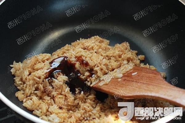 鍋里少量油,倒入米飯,小火先把米飯炒散。再旺火,翻炒幾下,沿鍋邊淋入加飯酒,生抽,蠔油。炒干了。