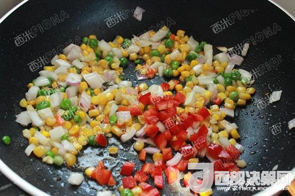 適量油,爆香蒜末,洋蔥丁。出味道了倒入玉米青豆胡蘿卜丁。翻炒幾下,加入彩椒丁,適量鹽。盛出。