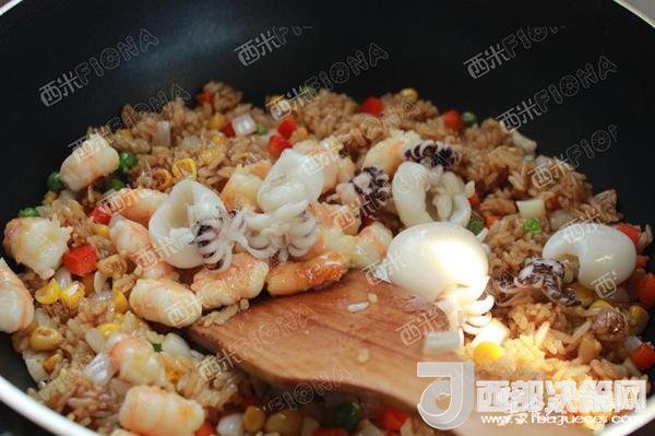 最后加入炒好的蝦仁,墨魚仔以及玉米青豆胡蘿卜等。再翻炒幾下。調(diào)入適量鹽。