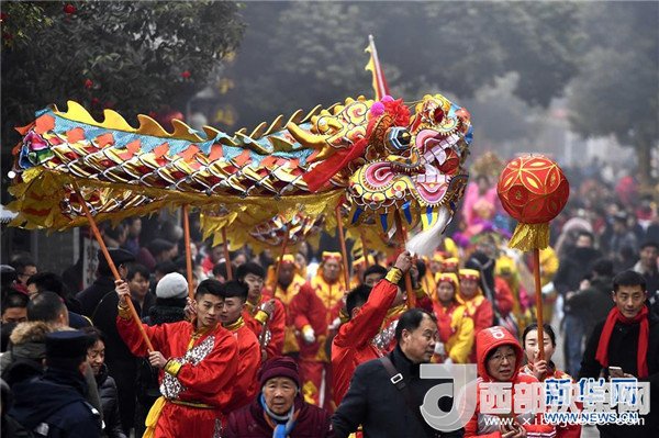1月1日,在臺兒莊古城,民間藝人在進行舞龍巡游。(記者 郭緒雷 攝)