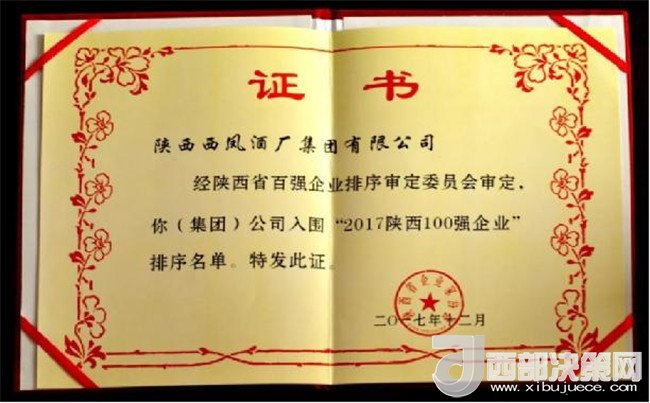 陜西西鳳酒廠集團榮獲“2017陜西企業(yè)100強”榮譽稱號
