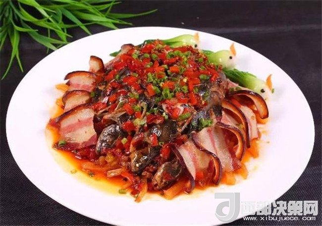 第二步,黃辣丁宰殺治凈,剁掉魚(yú)鰭以及硬刺,加入適量蔥、姜、料酒、胡椒粉、鹽腌制入味,然后拌入紅剁椒醬100克,碼到大碗底部中央,邊上排放臘肉片,上面鋪紅薯干,放入蒸箱旺火蒸15分鐘。